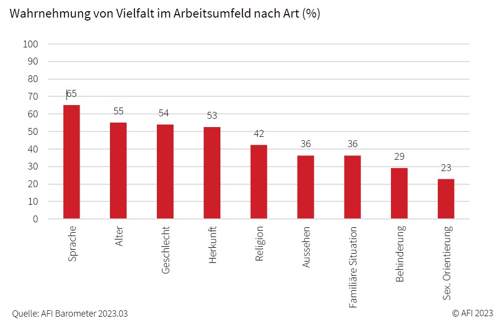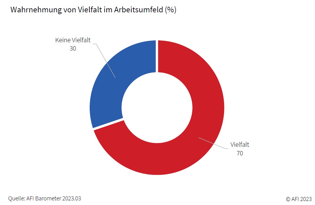 In Anlehnung an die zurzeit laufende Studie von Eurac Research zum Thema Diversity Management befasst sich der Sonderteil der Frühlingsausgabe 2023 des AFI-Barometers mit der Vielfalt am Arbeitsplatz. Wenn auch in unterschiedlicher Ausprägung, sind immerhin 70 Prozent der Befragten der Auffassung, dass die Welt der Arbeitnehmer und Arbeitnehmerinnen vielfältig ist. Für die restlichen 30 Prozent gibt es hingegen keine offensichtlichen Unterschiede.