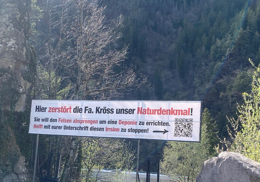 Wer am Freitag ins Sarntal fuhr, dem bot sich ein ungewöhnliches Bild. Vor dem Tanzbach-Felsen standen zahlreiche Unterstützer, die sich für den Erhalt dieses Sarner Wahrzeichens ausgesprochen haben. Auch Vertreter der Presse waren vielzählig zugegen. „Hier zerstört die Fa. Kröss unser Naturdenkmal! Sie will den Felsen absprengen um eine Deponie zu errichten. Helft mit eurer Unterschrift, diesen Irrsinn zu stoppen!“, stand in großen Lettern auf einem Plakat, welches direkt an der Einfahrt zur Firma Locher angebracht war.