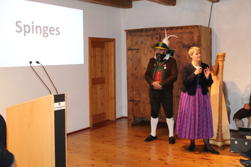 Agnes Egger Andergassen, die Vorsitzende der ArGe Lebendige Tracht, stellte abschließend noch die Tracht des Jahres vor. Dabei entschied sie sich für die historische Tracht der Schützenkompanie Katharina Lanz von Spinges, die zum 50-jährigen Jubiläum der Schützenkompanie 2009 anhand eines 200 Jahre alten Musters gefertigt wurde. Das besondere an der Tracht ist die „Pfoat“ mit dem besonders gefältetem Kragen.