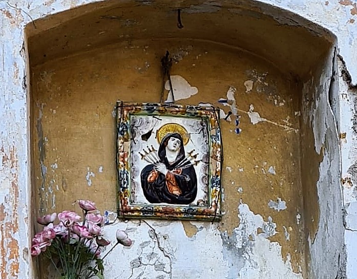 La pittura della parete del vecchio edificio – frose i resti di un ulteriore capitello – è in parte sgretolata, i colori si sono smarriti nel tempo. Ma l’immagine di Maria con il cuore trafitto dalle spade è protetta dalla pioggia e dal vento, collocata com’è ben all’interno della nicchia.