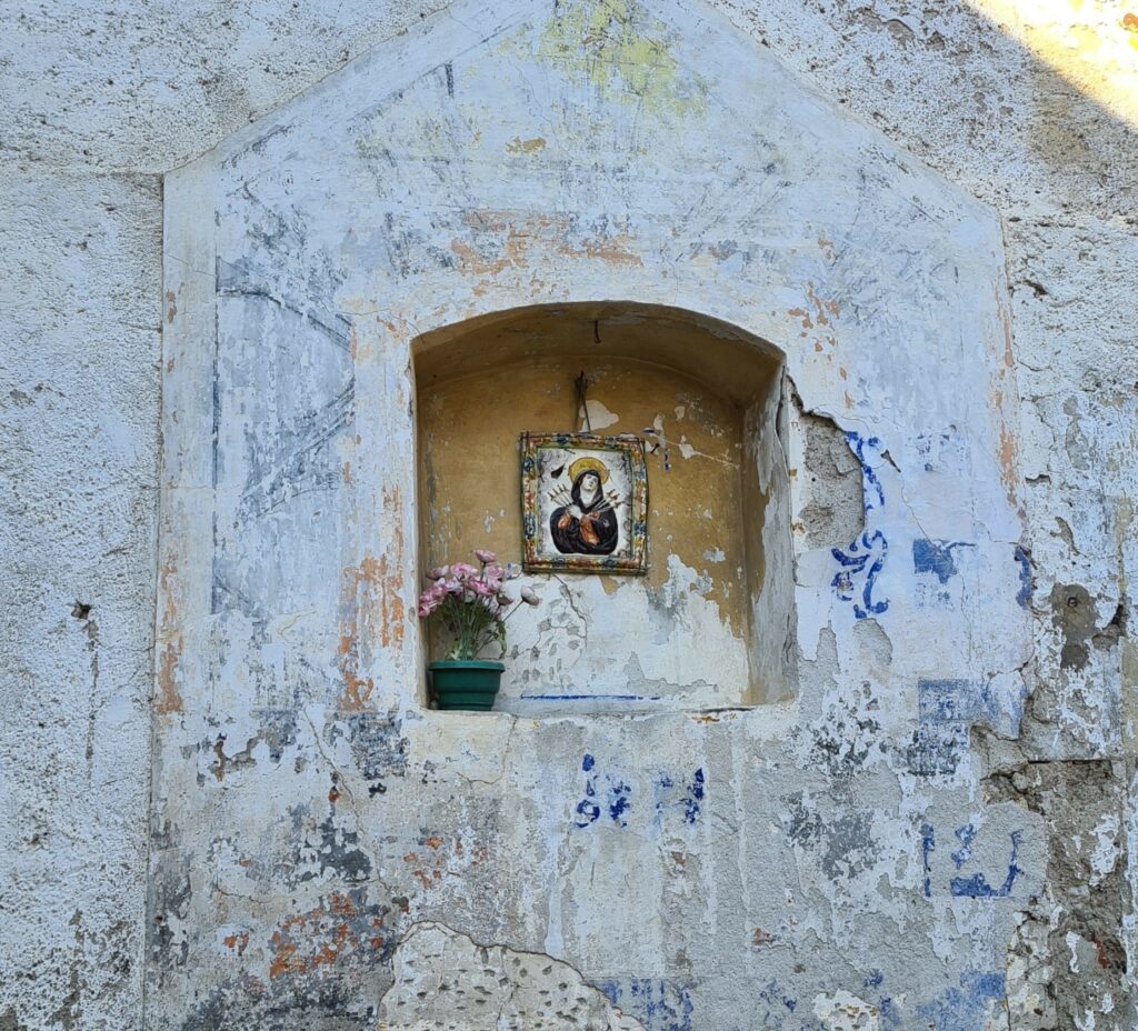 La pittura della parete del vecchio edificio – frose i resti di un ulteriore capitello – è in parte sgretolata, i colori si sono smarriti nel tempo. Ma l’immagine di Maria con il cuore trafitto dalle spade è protetta dalla pioggia e dal vento, collocata com’è ben all’interno della nicchia.