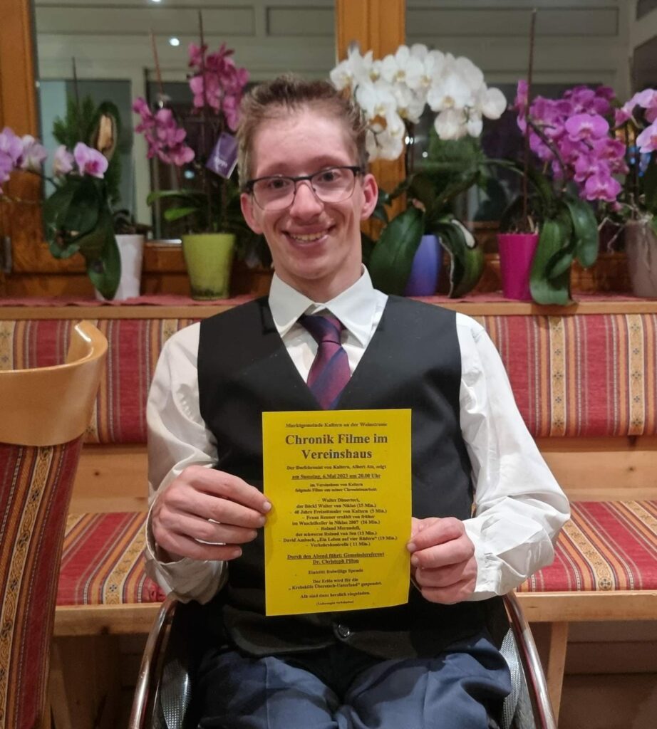 „Ein Leben auf vier Rädern“ – so lautet der Titel des Filmprojektes von Albert Atz, dem Dorfchronisten von Kaltern. David Ambach, der im Film präsentiert wird, ist 20 Jahre jung und ist Portier im Gemeindehaus von Kaltern. Seit seiner Geburt hat er eine körperliche Beeinträchtigung, die sich Spina Bifida nennt – auf Deutsch übersetzt „Offener Rücken“.