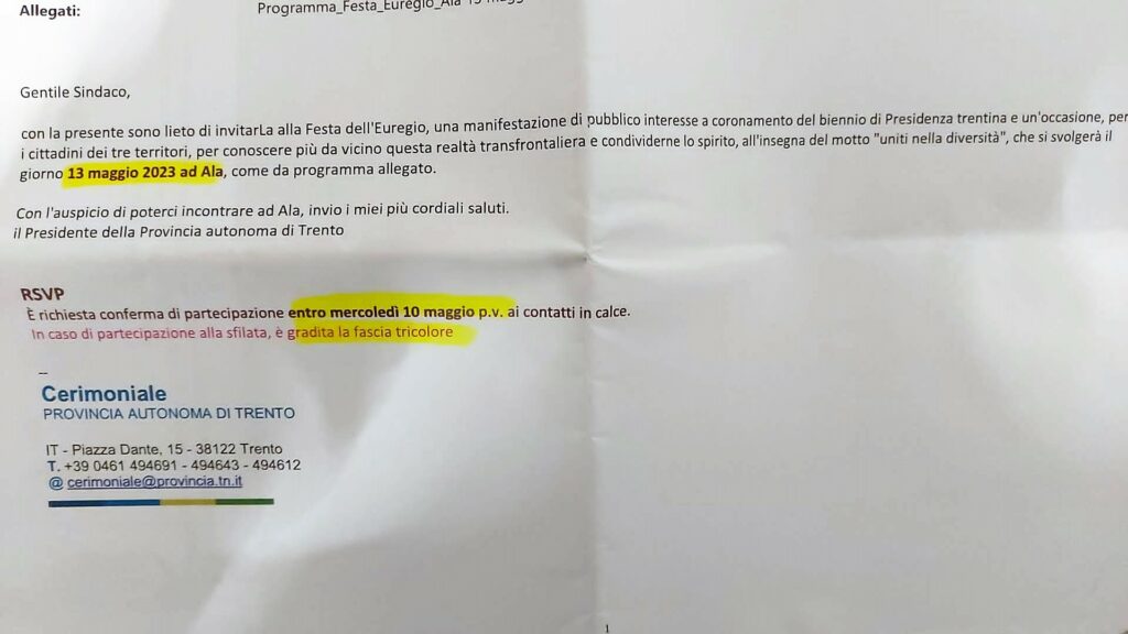 Parliamo dell‘invito, trasmesso a tutti i Sindaci da parte dell’Ufficio Cerimoniale della Provincia di Trento, a partecipare alla Festa dell’Euregio che si terrà sabato prossimo 13 maggio in quel di Ala, in particolare a prendere parte alla sfilata.  L’ultima riga della comunicazione è davvero „illuminante„.
