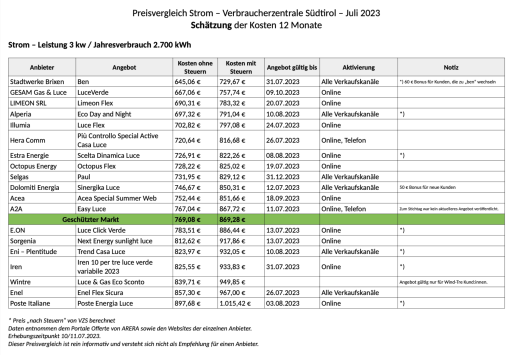 Nach Plänen der Regierung soll am 10. Jänner 2024 der Tarif des „geschützten Markts“ im Energiesektor ausgedient haben. Grund für die Verbraucherzentrale Südtirol, einen Blick auf die aktuellen Bedingungen am Strom-Markt zu werfen. Der aktuelle Preisvergleich zeigt ein kleineres Sparpotential beim Wechsel vom geschützten auf den freien Markt, und hohe (!) Preisunterschiede zwischen den Anbietern am freien Markt.