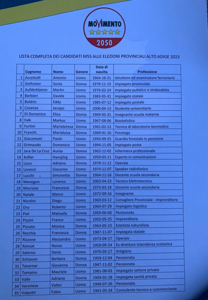 Alle Berufskategorien, von Bildung bis Soziales, seien vertreten, ebenso wie die Mobilität. Die verschiedenen Sprachgruppen, die Rentner und die jungen Menschen seien durch eine Kultur der Nachhaltigkeit vereint, die das Wohl der Menschen in den Mittelpunkt stelle, aber auch sicherstellt, dass die vielen Ressourcen unserer reichen Region gerechter und im Einklang mit der Umwelt verteilt werden, so die 5-Sterne-Bewegung in einer Aussendung.