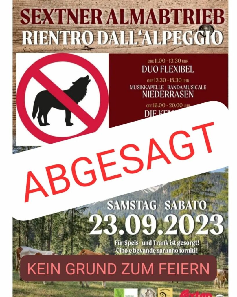 Es soll ein Zeichen gegen den Wolf sein, teilt die Bauernjugend Sexten mit. Die Landwirte hätten gerade aufgrund der aktuellen Wolfsrisse auf den Sextner Almen keinen Grund zum Feiern.