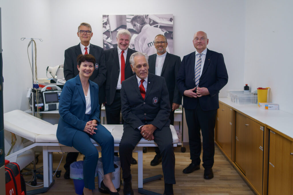 Bei einer kleinen Geburtstagsfeier lassen – im Bild vorne – Elisabeth Rathgeb (Caritas Tirol) und Günther Ennemoser (Rotkreuz-Tirol-Präsident) sowie – im Bild hinten von links nach rechts – Rotkreuz-Geschäftsführer Thomas Wegmayr, Rotkreuz-Chefarzt Thomas Fluckinger, Bischofsvikar Jakob Bürgler und Franz Katzgraber (Land Tirol) die vergangenen zehn medcar(e)-Jahre Revue passieren und blicken zuversichtlich in die Zukunft. – Foto: Credit Rotes Kreuz Tirol|Martina PurnerÂ