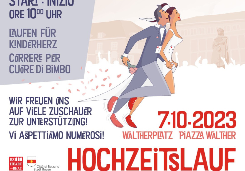 Es soll ein Aktionstag für alle Brautpaare sein, welche im kommenden Jahr heiraten möchten. Am Samstag, 7. Oktober mit Treffpunkt um 10 Uhr organisiert „BZHEARTBEAT“ eine außergewöhnliche Veranstaltung. Der erste Südtiroler Hochzeitslauf bietet allen Paaren nicht nur Spaß an, sondern die Heiratswilligen können mit ihrem Startgeld auch den Verein „Kinderherz“ unterstützen und – wenn sie möchten – ihr Hochzeitskleid in der Folge dem Secondhand-Shop Kleopatra in Bozen überlassen. Dort können die Hochzeitskleider dann gegen eine freiwillige Spende erworben werden. Auch diese Spenden kommen „Kinderherz“ zugute.