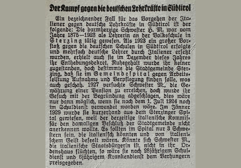Wie die Historikerin Dr. Margareth Lun berichtet, waren in den staatlichen Schulen die deutschen Lehrer vom Dienst suspendiert und durch italienische Lehrkräfte aus anderen Provinzen ersetzt worden. Was das für die einzelnen deutschen Lehrkräfte bedeuten konnte, schilderte die in Innsbruck erscheinende Zeitung „Tiroler Anzeiger“ am 27. März 1929 anhand des Beispiels der Behandlung einer geistlichen Schwester. Die barmherzige Schwester H.M. war 1923 ihrer Lehrstelle in Sterzing enthoben worden. Sie fand „gegen Arbeitsleistung Aufnahme und Verpflegung“ im Sterzinger Gemeindespital. 1927 wurde ihr die Gewährung der Pension mit der Begründung verweigert, dass sie diese nur dann hätte erhalten können, wenn sie weiter im Schuldienst geblieben wäre. Im Jahre 1929 wurde sie aus dem Spital gewiesen, weil dort nur italienische Schwestern tätig sein sollten.