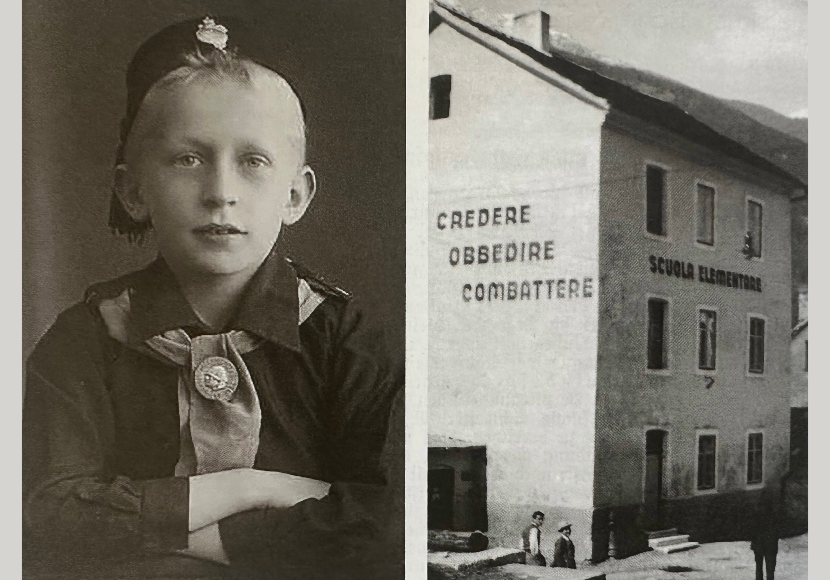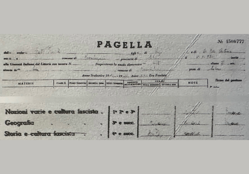 Wie in der Schule faschistische Indoktrination betrieben wurde, darüber gibt ein Schulzeugnis aus dem Schuljahr 1940/41 Auskunft. In diesem Schulzeugnis werden gleich zwei benotete faschistische Unterrichtsfächer angeführt: „Verschiedene Kenntnisse und faschistische Kultur“ (nozioni varie e cultura fascista) sowie „Geschichte und faschistische Kultur“ (storia e cultura fascista). Man kann sich ungefähr vorstellen, wie dem Regime ergebene und auf ihr berufliches Fortkommen bedachte italienische Lehrer versucht hatten, die Kinder ideologisch zu drillen.