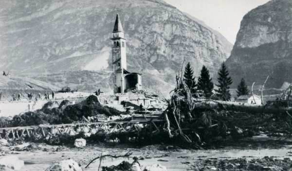 Un’ora dopo, esattamente alle 22.39, all’improvviso un cupo e lungo boato spezzò il silenzio in cui era avvolta la valle. Un’enorme frana staccatasi dal pendio che occupava da millenni, scese rapidissima verso il lago artificiale, creando un’ondata gigantesca. In pochi attimi la tragedia: l’onda d’acqua e fango, alta più di 200 metri, oltrepassò la diga – che resistette all’urto – piombando sulla valle, distesa lungo il Piave, come a straziarne il corpo e l’anima.