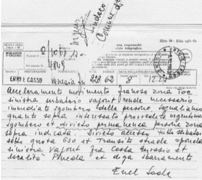 Quella sera il campanello di casa Aste suonò concitato per alcune volte: era il carabiniere Francesco D’Arrico che portava l’ordine del comandante la stazione di Longarone di raggiungere al più presto la strada per le frazioni di Dogna e di Provagna e di chiuderla alla circolazione. Pur avendo finito il suo turno di lavoro alle 18.00, gli ordini non si potevano discutere per cui Rinaldo si rimise in fretta la divisa. Alla moglie che lo pregava di fermarsi giusto il tempo per prendere un caffè, l’uomo rispose solo con un cenno del capo e con un sorriso che voleva essere rassicurante. Poi le diede un bacio e uscì di casa dicendole che sarebbe tornato presto. Quelle sarebbero state le ultime parole fra loro. Prima delle 21.00 la strada era stata bloccata, ma alla gente dei paesi non venne dato alcun avviso di evacuazione semplicemente perché non esisteva nessun ordine in tal senso.