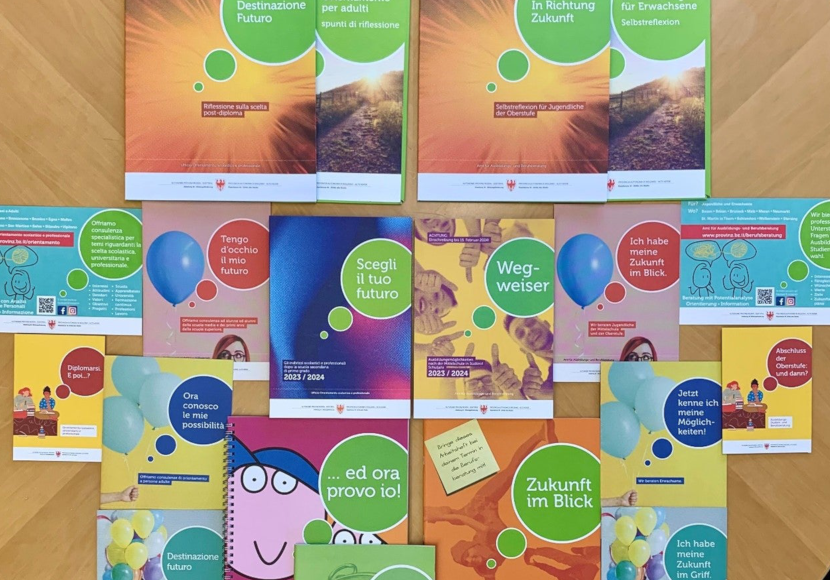 m neuen Erklärvideo erhalten Interessierte einen Überblick über die Bildungssäulen beziehungsweise über die deutsche/ladinische und die italienische Schulwelt in Südtirol. Dieses Video steht auch in englischer Sprache auf der Homepage zur Verfügung. Eltern finden hilfreiche Tipps zur Begleitung im „Wegweiser“ und in der italienischen Broschüre „Guida alla scelta“. Das Faltblatt Abschluss der Oberstufe „Was dann?/ Diplomarsi – e poi?“ ist eine Informationshilfe für Jugendliche der Oberstufe.