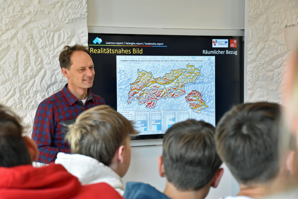 Zum fünfjährigen Jubiläum des Euregio-Lawinenreports wurde die Plattform Anfang des Jahres in die interaktive ganzjährige Ausstellung des Innsbrucker Euregio-Infopoints integriert. Interessierte können hier nicht nur aktuelle Informationen zur Lawinengefahr abrufen, sondern auch Lawinenkunde lernen – von den verschiedenen Lawinengefahrenstufen über unterschiedliche Arten von Lawinen bis zu historischen Lawinenereignissen seit dem Ersten Weltkrieg. Zudem lädt ein multimediales Quiz Alt und Jung dazu ein, das Gelernte nochmals vor Ort zu testen. Die Ausstellung hat nun zusätzlich für die Lawinen-Informationstage für Schulen Verwendung gefunden.