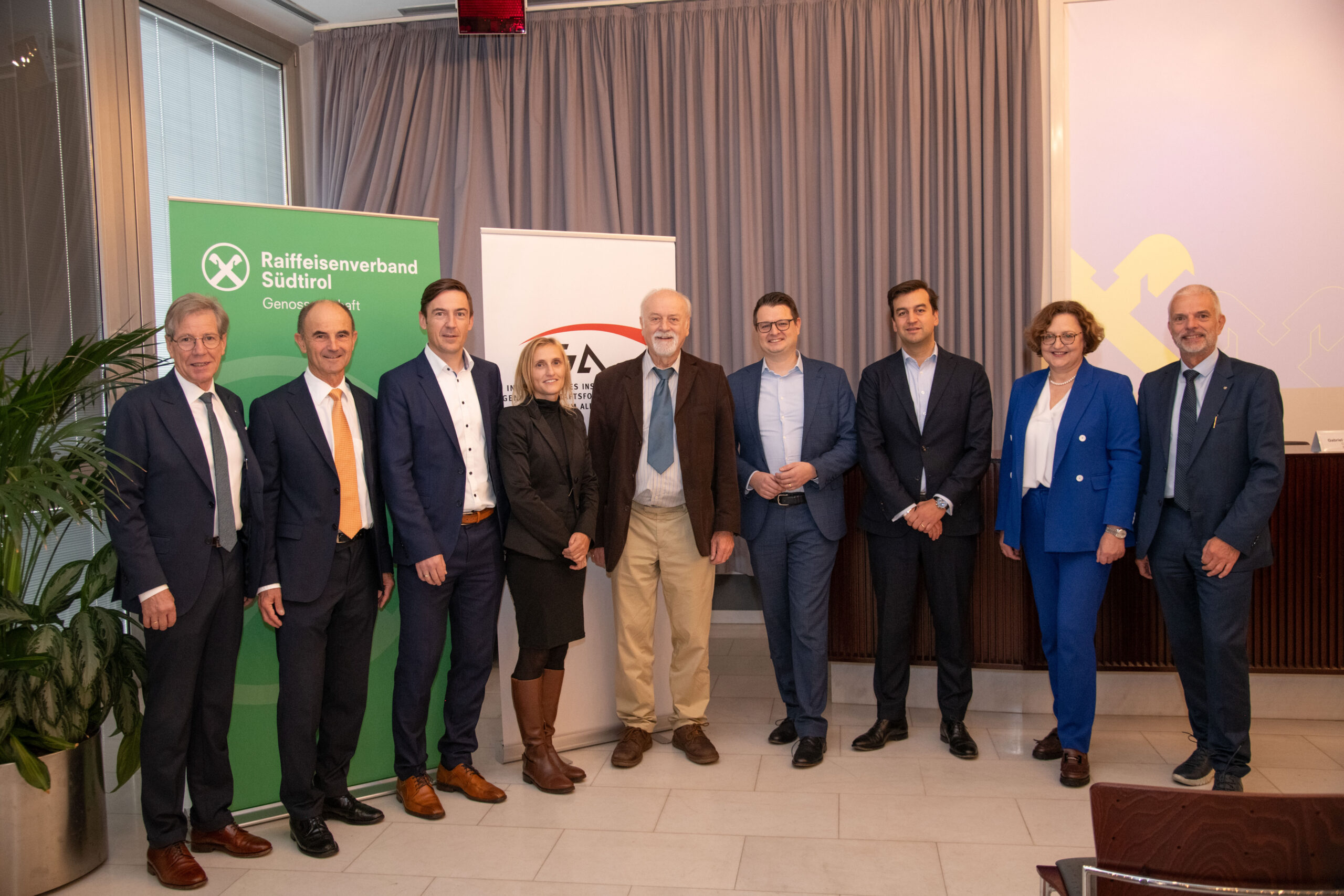 Im Bild v.l.n.r.: Herbert von Leon (Obmann des Raiffeisenverbandes), Prof. Michael Nippa (Referent), Mag. Manuel Schwarzinger (Referent), Cornelia Kupa (Organisationsteam), Prof. Arnulf Perkounigg (Vorsitzender des IGA), Florian Pedron (Raiffeisenverband Südtirol), Gabriel von Mitschke-Collande (Referent), Regina Wenninger, (Stellvertr. Vorstandsvorsitzende des IGA vom Genossenschaftsverband Bayern), Christian Tanner (Raiffeisenverband Südtirol).