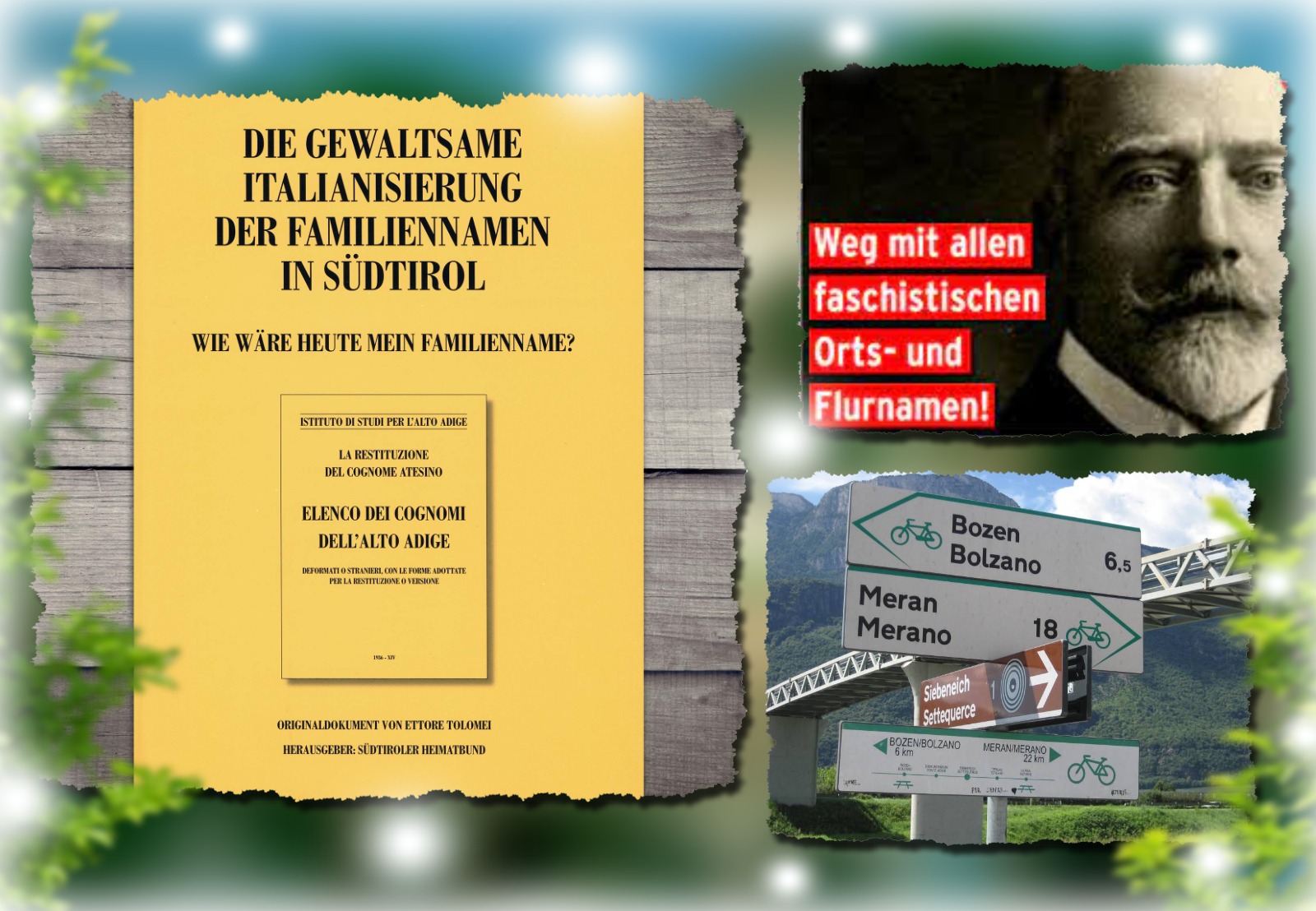 La ridenominazione dei luoghi, stabilita dal regio decreto, strappa in modo violento un pezzo di storia tirolese. È un intervento arbitrario su fatti storici. Luoghi che non sono mai stati italiani si trovano ora improvvisamente a portare un nome diverso. Anche i paesi, le località, come ogni persona, hanno un diritto incondizionato al proprio nome. Molti di questi nuovi nomi sono semplicemente incomprensibili, alcuni sono stati tradotti e altri – così si sostiene – sono stati presi dalla storia. Ci sono nomi in Alto Adige a cui non solo la patria più strettamente definita ha un diritto inviolabile, ma che hanno anche una forte notorietà all’estero e quando vengono menzionati fanno scaturire l’idea di un certo carattere, sia esso un pezzo della nostra gloriosa storia, una qualche peculiarità del nostro essere, o un bene della natura che è collegato a quel particolare nome.