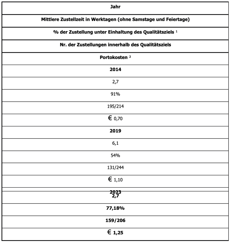 Zum Schaden der Spott: das Ganze ging einher mit einer Steigerung der Tarife. Zahlte man 2014 für einen Normalbrief noch 70 Cent, muss man 2023 hierfür stolze 1,25 Euro hinblättern. Gegenüber einer Preissteigerung von fast 80 Prozent hat die Erreichung der Qualitätsziele um 15 Prozent abgenommen.