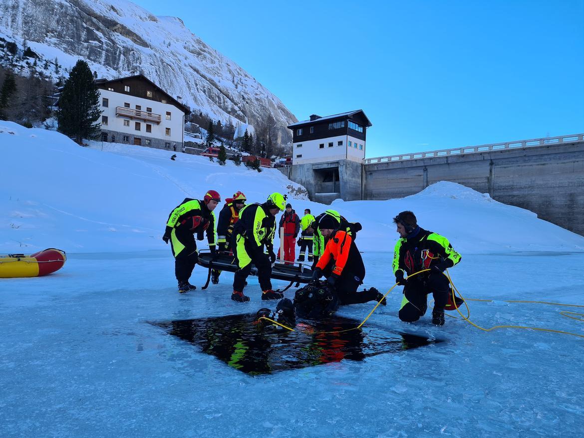 Siamo al lago di Fedaia, 2.050 metri di quota in Val di Fassa, ai piedi della Marmolada. Qui, con una simulazione di intervento, tre sommozzatori si sono preparati ad entrare nel Nucleo specialistico del Corpo permanente dei Vigili del fuoco di Trento.