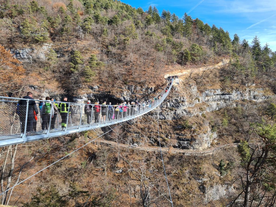 Taglio del nastro  venerdì scorso per il  ponte sospeso nel Monte di Mezzocorona, a circa 130 metri di altezza rispetto al suolo, in un’area da cui si gode una vista mozzafiato e che si inserisce in un percorso che intende valorizzare la zona montuosa anche grazie al vicino skywalk, raggiungibile con la funivia a monte del paese rotaliano.