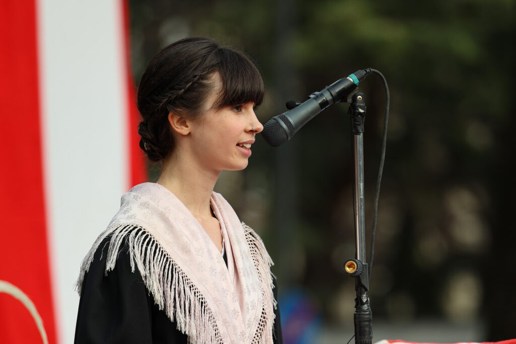 Marketenderin Michaela Geiser, Miss der Herzen 2022, bei ihren Grußworten. (© Südtiroler Schützenbund/Richard Andergassen)