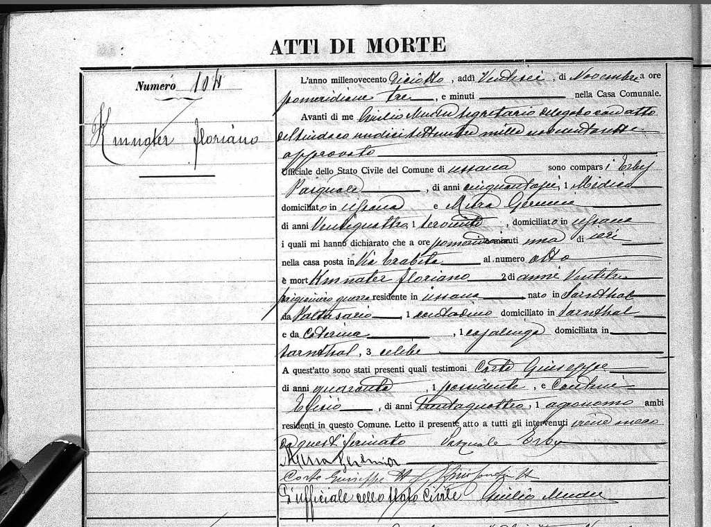 Il 26 novembre 1918 davanti al segretario delegato del comune di Ussana si presentano il medico e un testimone: dichiarano che il giorno prima è deceduto „Kmnater Floriano di anni 23, figlio di Baltasario, contadino, e Caterina, casalinga, nato e domiciliato in Sarnthal, prigioniero di guerra“.