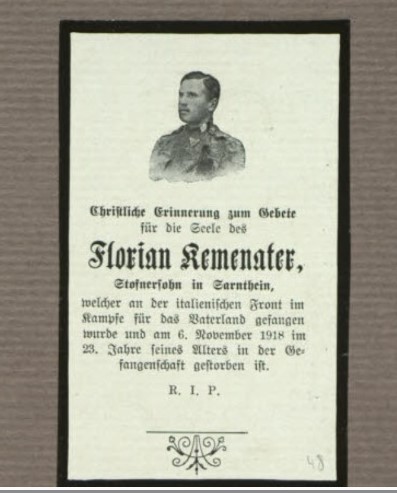 Nell’edizione del 6 settembre 1919, sul Foglio Annunzi Legali appare la notifica dell’avviamento „dietro istanza di Luigi Kemenater ‚Dickerbauern‘ in Sarentino, della procedura allo scopo di accertamento della morte di Floriano Kemenater … che, quale prigioniero di guerra italiano, dovrebbe essere morto di febbre spagnola l’otto o dieci novembre 1918 presso il distaccamento Usonna in Sardegna„