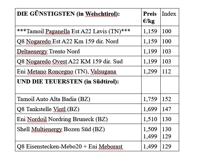 „Im Zeitalter des Umweltschutzes werden Elektroautos zunehmend populär. Doch neben den bereits etablierten Elektrofahrzeugen und Hybridautos gibt es eine alternative, umweltfreundliche Option: Bio-Compressed Natural Gas (Bio-CNG). Dieses Biomethan bietet eine bessere Umweltbilanz als herkömmliche Kraftstoffe, ja sogar als Elektro-Autos. Leider kann Bio-CNG im nachhaltigen Südtirol nicht getankt werden. Umso überraschender ist, dass man auf der Autobahntankstelle zwischen Trento Nord und S.Michele/Mezzocorona das günstigste Methangas der Region Welschtirol-Südtirol tanken kann und dafür auch noch Biomethangas in den Gastank kommt“, erklärt der Verbraucherschutzverein.