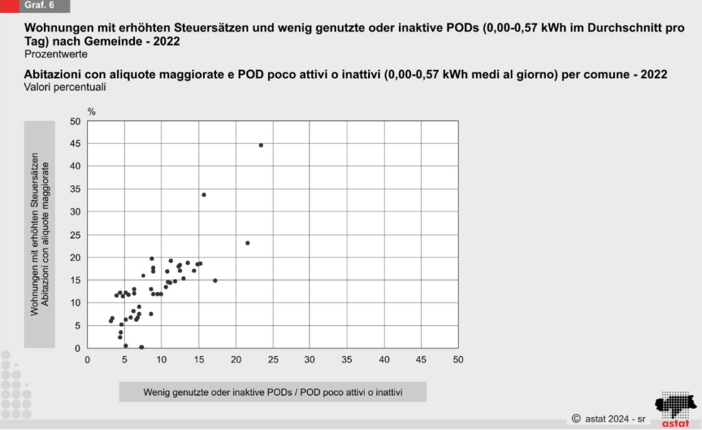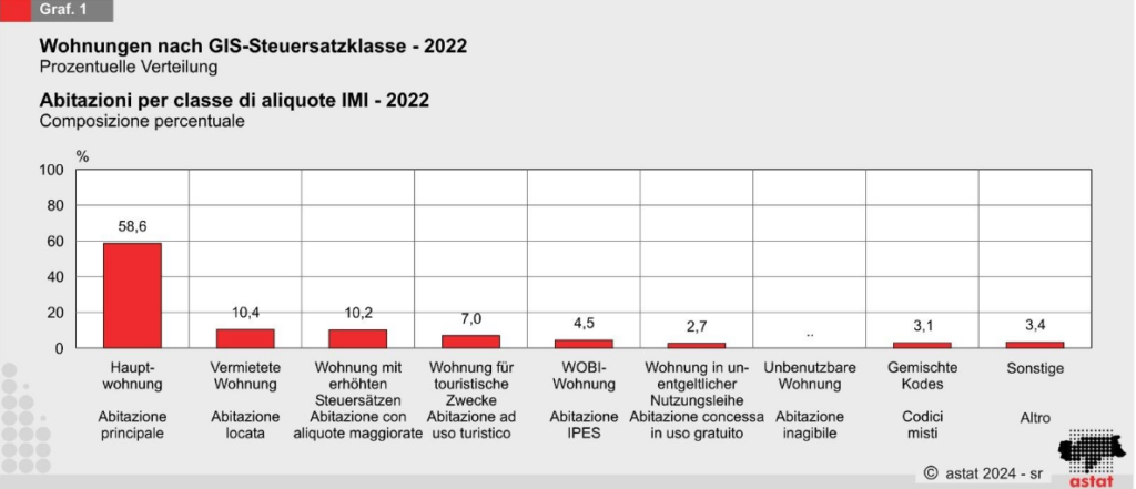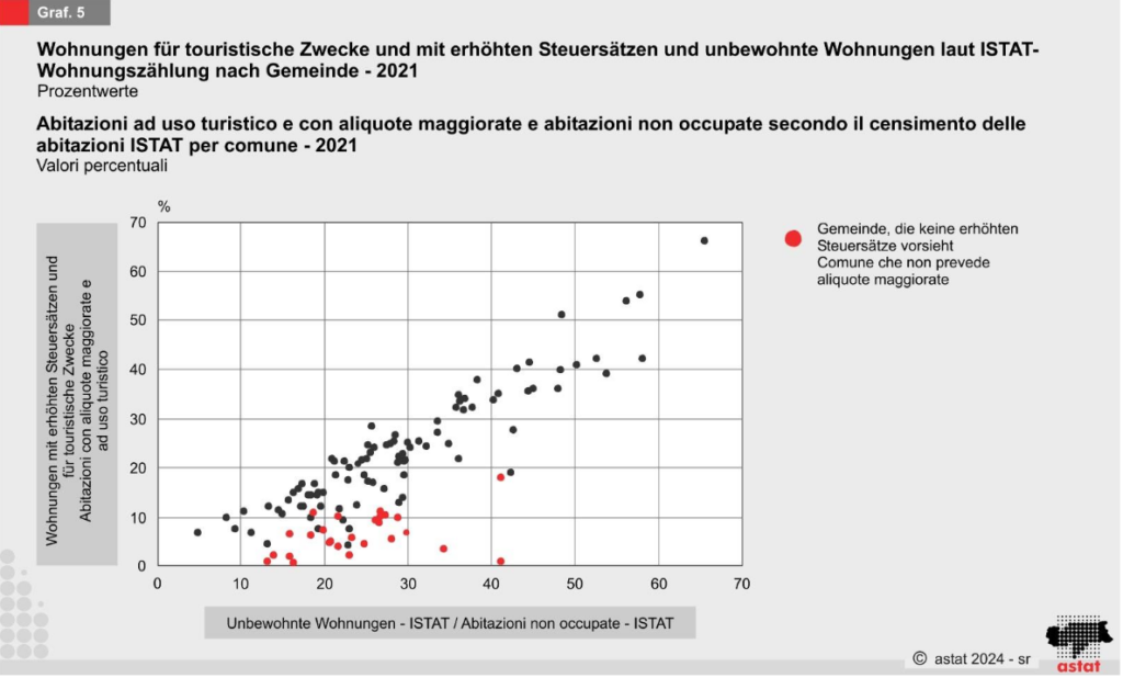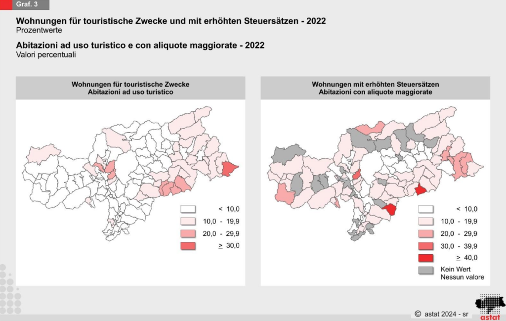 Das ASTAT wurde beauftragt, eine Schätzung der wenig genutzten oder ungenutzten Wohnungen vorzunehmen. Die GIS-Datenbank wurde dabei als Vergleichswert für die offizielle Zahl laut ISTAT-Wohnungszählung 2021 verwendet. Diese ergab, dass der Anteil leerstehender oder von nicht ansässigen Personen bewohnter Wohnungen bei 22,8 Prozent liegt, wobei touristische Hochburgen die höchsten Werte aufweisen.