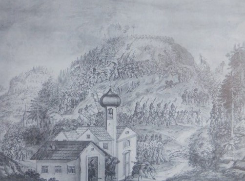 „…La Compagnia di Bersaglieri o “Schützen” di (NdR: Königsberg, ai comandi del Capitano Gioachino Dalle Mule e del Primo Tenente) Pietro Franch si trovò ben presto a dover essere partecipe dei combattimenti, quando, nel febbraio 1797, gli scontri con i francesi ripresero, vista la necessità che avevano i galli di sfondare verso i territori dell’Austria interna. Già il 2 febbraio i napoleonici si erano scontrati con le compagnie stanziate a Giovo, fra cui quella del Franch, e i regolari austriaci, ed erano riusciti ad occupare il territorio di Giovo e Lisignago, portandosi fino a Cembra, pur dovendo poi l’8 febbraio ritirarsi fino a Lavis e poi oltre. Fra febbraio e i primi di marzo molti furono i combattimenti fra Giovo e Lisignago, anche se i francesi non riuscirono mai a giungere a Cembra. Fin da fine febbraio e primi di marzo, i francesi ricomparvero in gran numero nel territorio di Giovo. Il 2 marzo vi fu un primo scontro importante fra truppe francesi e soldati austriaci nella zona di Palù…“