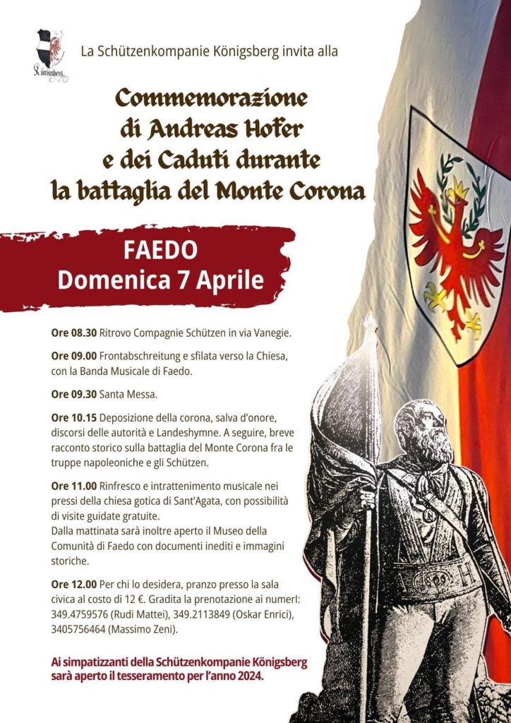E sono proprio quelli gli avvenimenti che verranno ricordati domenica 7 aprile a Faedo. La cerimonia, organizzata dalla SK Königsberg si aprirà con il ritrovo delle Compagnie in via Vanegie e quindi, alle ore 09.00, la Frontabschreitung e la sfilata fino alla Chiesa, con l’accompagnamento della Banda Musicale di Faedo. Al termine della Santa Messa, alle 10.15, è prevista il momento commemorativo, con la deposizione di una corona, la Ehrensalve, gli interventi delle autorità ed il Landeshymne. Farà seguito il racconto degli avvenimenti storici del 1796, con particolare riferimento alla battaglia di Monte Corona del 2 marzo 1797