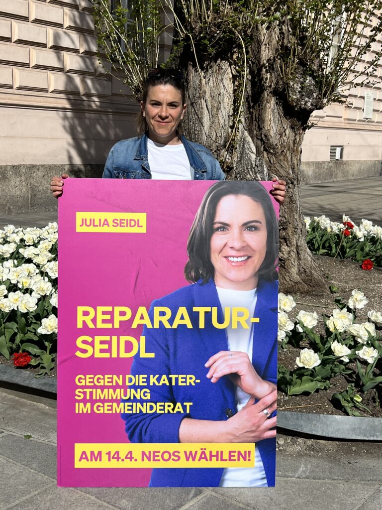 NEOS-Bürgermeisterkandidatin Julia Seidl präsentiert die letzte Plakatserie für die Innsbruck-Wahl. Mit einer „Reparatur-Seidl“ wollen die Pinken den Gemeinderat wieder auf die richtige Spur bringen – Foto: NEOS