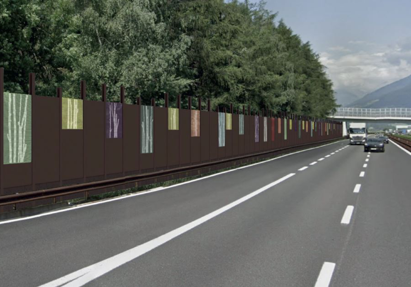 „Es handelt sich um neuartige Lärmschutzwände, die sich in die Umgebung einfügen, ohne die Fahrer abzulenken“, berichtet Giorgio Gottardi, Direktor im Landesamt für Landesplanung und Kartografie. Verwendet werden vier bis fünf Meter hohe Paneele aus transparentem Acrylglas und Aluminium, die auf Fundamentstrukturen aus Beton gründen. Eine schallabsorbierende, dunkelbraun-rote Schicht aus Blähtonbeton oder Bimsstein wirkt dem Verkehrslärm entgegen. Die Außenfassade der vorgefertigten Wand wird mit einem dunkelbraunen Schutzlack behandelt. Zum Schutz der Vögel werden die transparenten Paneele durch horizontale Streifen unterschiedlicher Form und Größe gekennzeichnet. Dabei werden auch landschaftliche, architektonische sowie künstlerische Aspekte berücksichtigt.