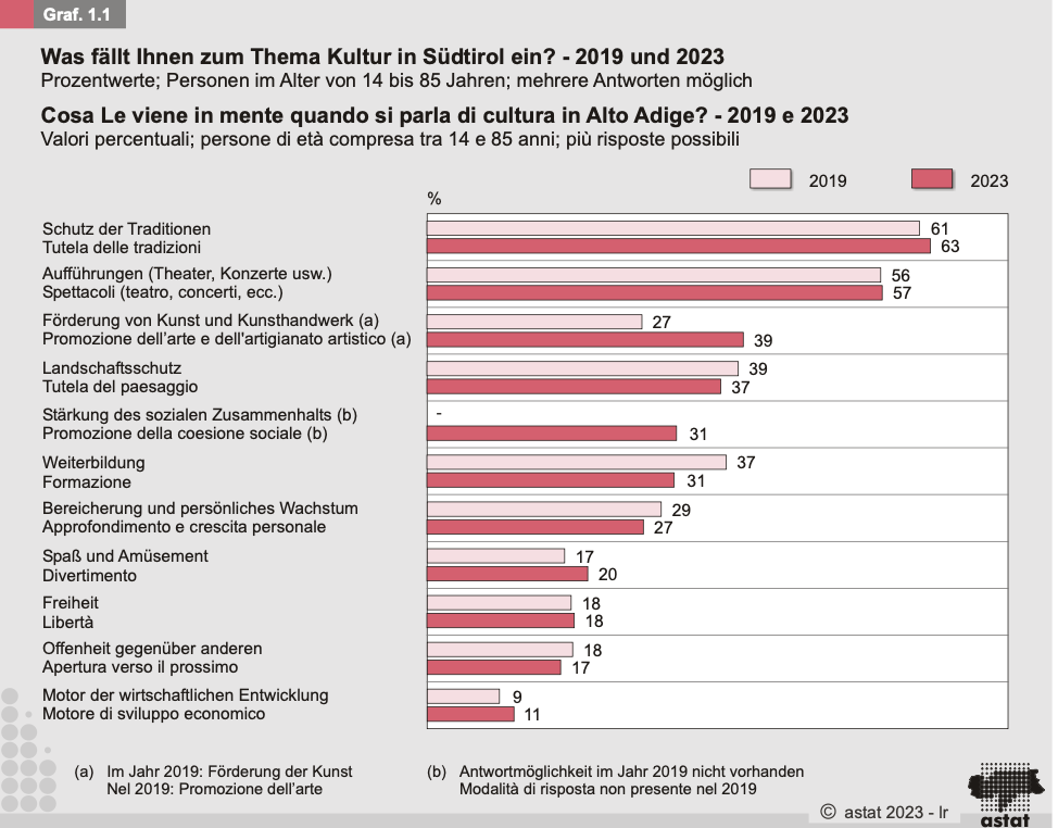 In Südtirol wird Kultur stark mit der Bewahrung lokaler Traditionen assoziiert, was 63 Prozent der Bevölkerung bestätigen. Diese hohe Zahl spiegelt die tiefe Verbundenheit der Südtiroler mit ihrer Geschichte und ihren kulturellen Wurzeln wider. Performative Künste wie Theater und Konzerte sind ebenfalls ein bedeutender Teil der kulturellen Identität, wobei 57 Prozent der Einwohner diese als zentral für das Kulturangebot betrachten. Weniger verbreitet, aber immer noch bedeutend, sind Aspekte wie Kunstförderung und Landschaftsschutz, die von 39 Prozent bzw. 37 Prozent der Bevölkerung geschätzt werden.