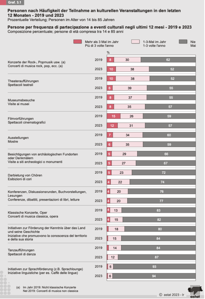 Die Teilnahme an kulturellen Veranstaltungen variiert je nach soziodemografischen Merkmalen wie Alter, Bildungsniveau und Sprachgruppe. Jüngere Menschen neigen dazu, modernere Veranstaltungsformate wie Rock- und Popkonzerte zu bevorzugen, während ältere Generationen sich häufiger für traditionelle Angebote wie Chöre und klassische Konzerte interessieren. Bildung spielt ebenfalls eine Rolle: Mit steigendem Bildungsniveau nimmt die Teilnahme an einer breiteren Palette von Kulturveranstaltungen zu. Es gibt auch geografische Unterschiede in der kulturellen Teilnahme. In städtischen Gebieten wie Bozen ist die Teilnahme an Kulturveranstaltungen generell höher als in ländlichen Regionen. Dies könnte teilweise durch eine bessere Verfügbarkeit und Vielfalt des Angebots in städtischen Zentren erklärt werden. Dennoch zeigt sich, dass auch in ländlichen Gebieten ein starkes Interesse an kulturellen Aktivitäten besteht, insbesondere wenn diese eng mit lokalen Traditionen verbunden sind.