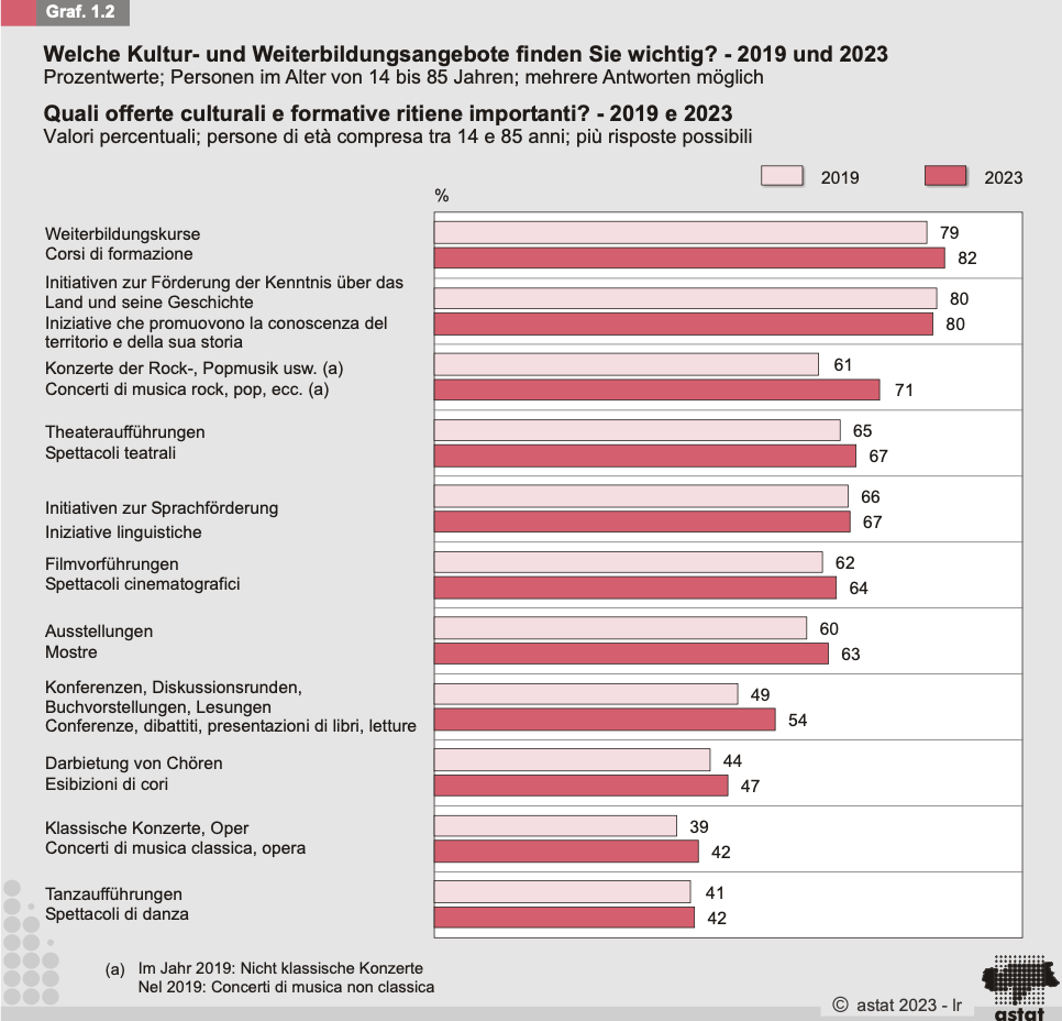 Das Landesinstitut für Statistik ASTAT hat kürzlich die Ergebnisse einer umfassenden Erhebung zur kulturellen Teilnahme und Zufriedenheit in Südtirol veröffentlicht. Die Studie, die im Frühjahr 2023 durchgeführt wurde, beleuchtet, wie die Südtiroler Kultur und Weiterbildung wahrnehmen und daran teilhaben.