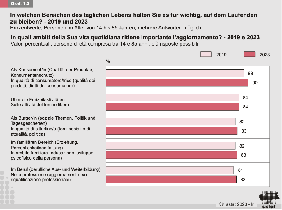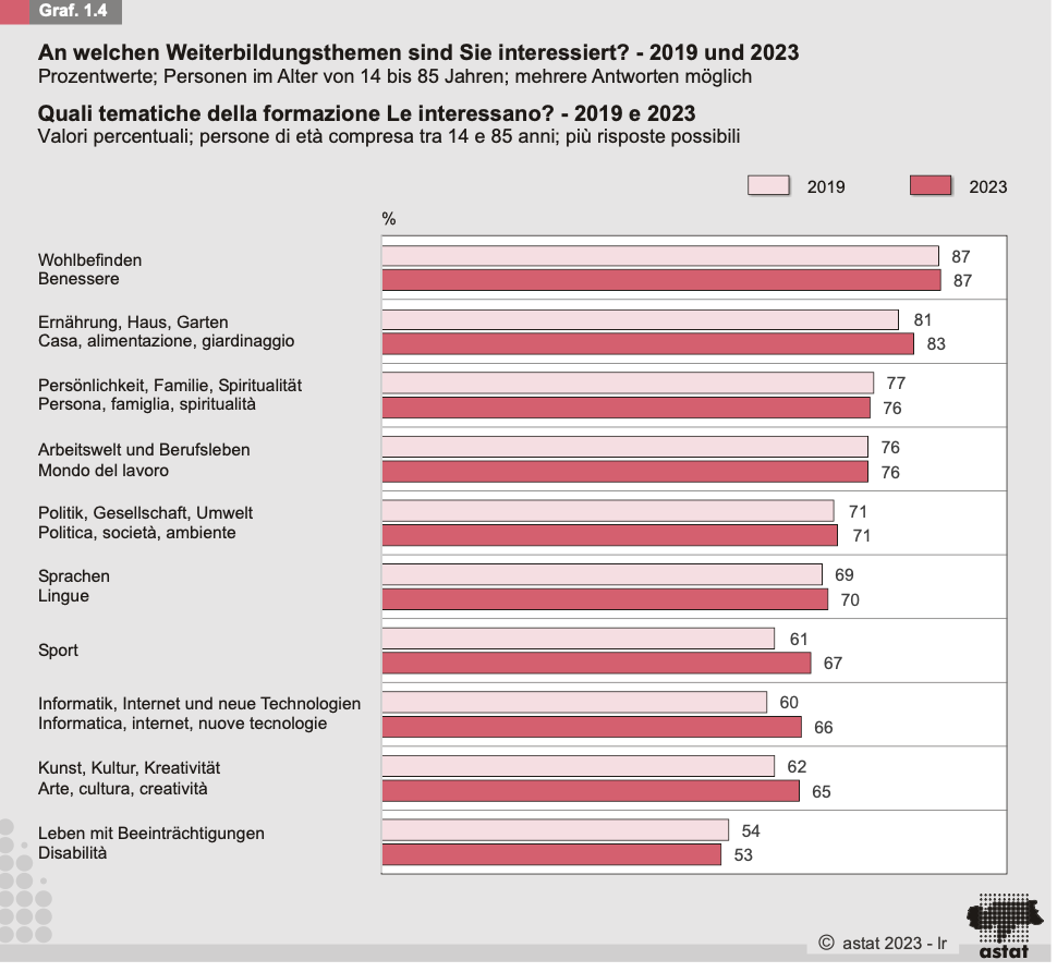 In Südtirol nimmt die Weiterbildung einen hohen Stellenwert ein, was sich in der steigenden Teilnahme an Bildungskursen widerspiegelt. Laut der Erhebung haben 45 Prozent der Bevölkerung im vergangenen Jahr mindestens einen Weiterbildungskurs besucht, was einen Anstieg im Vergleich zu früheren Jahren darstellt. Dieser Trend zeigt, dass die Südtiroler zunehmend bestrebt sind, ihre Fähigkeiten zu verbessern und sich persönlich sowie beruflich weiterzuentwickeln.