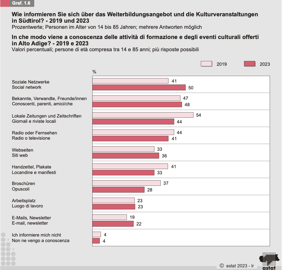 Soziale Netzwerke stehen an der Spitze der Informationsquellen in Südtirol, wobei 50 Prozent der Bevölkerung angeben, dass sie hierüber am häufigsten von kulturellen Ereignissen erfahren. Die Popularität sozialer Medien kann auf ihre unmittelbare und interaktive Natur zurückgeführt werden, die es Nutzern ermöglicht, Inhalte schnell zu teilen und zu kommentieren. Dies fördert nicht nur eine breitere Verbreitung von Informationen, sondern auch eine stärkere Einbindung der Gemeinschaft. Neben sozialen Netzwerken spielen auch spezialisierte Webseiten und Newsletter eine wichtige Rolle. Diese Plattformen bieten oft detailliertere Informationen und können gezielt auf die Interessen spezifischer Zielgruppen zugeschnitten werden. Die Nutzung von Newslettern ist besonders bei jenen beliebt, die regelmäßig und direkt über bevorstehende Veranstaltungen oder Kurse informiert werden möchten.