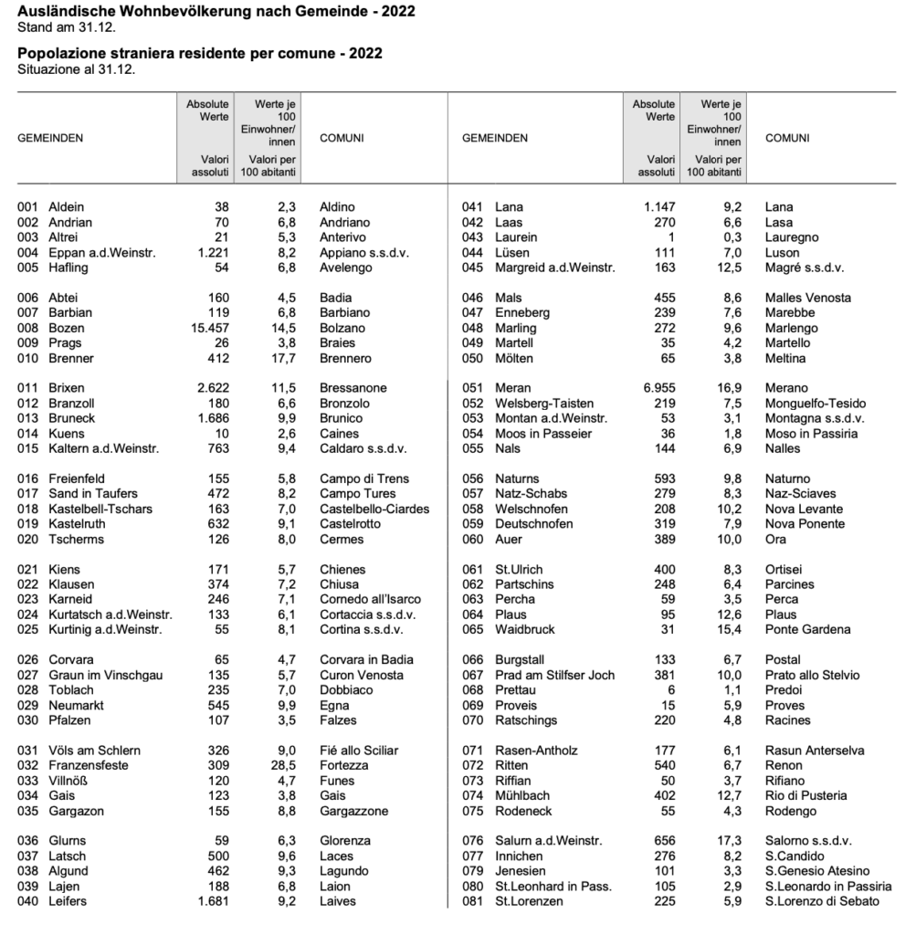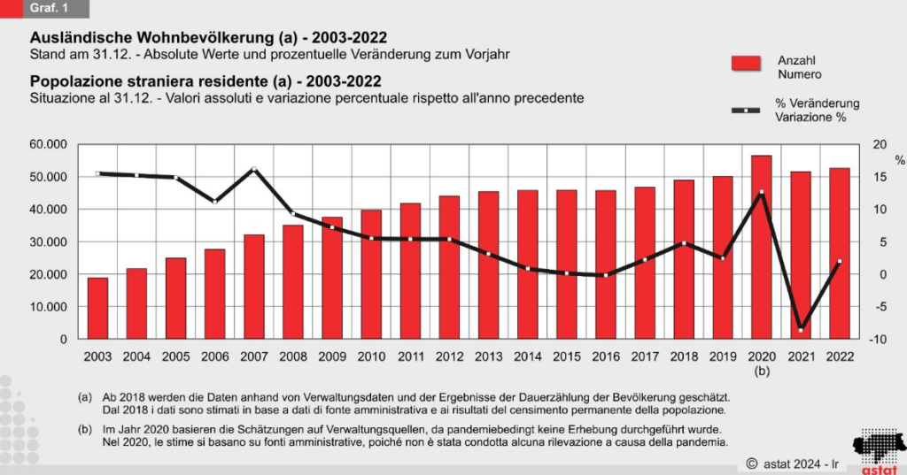 Gemäß Schätzungen des ISTAT lebten am 31. Dezember 2022 52.647 Personen ohne italienische Staatsbürgerschaft in Südtirol. Das ASTAT teilt mit, dass die Zahl der ausländischen Einwohner somit um zwei Prozent gestiegen ist, was einem Zuwachs von 1.054 Personen im Vergleich zum Vorjahr entspricht. Die meisten Zuwächse in Südtirol gehen auf Zuzüge von Ausländern zurück (6.996). Die Abwanderung ist mit 3.863 vergleichsweise niedrig.Â