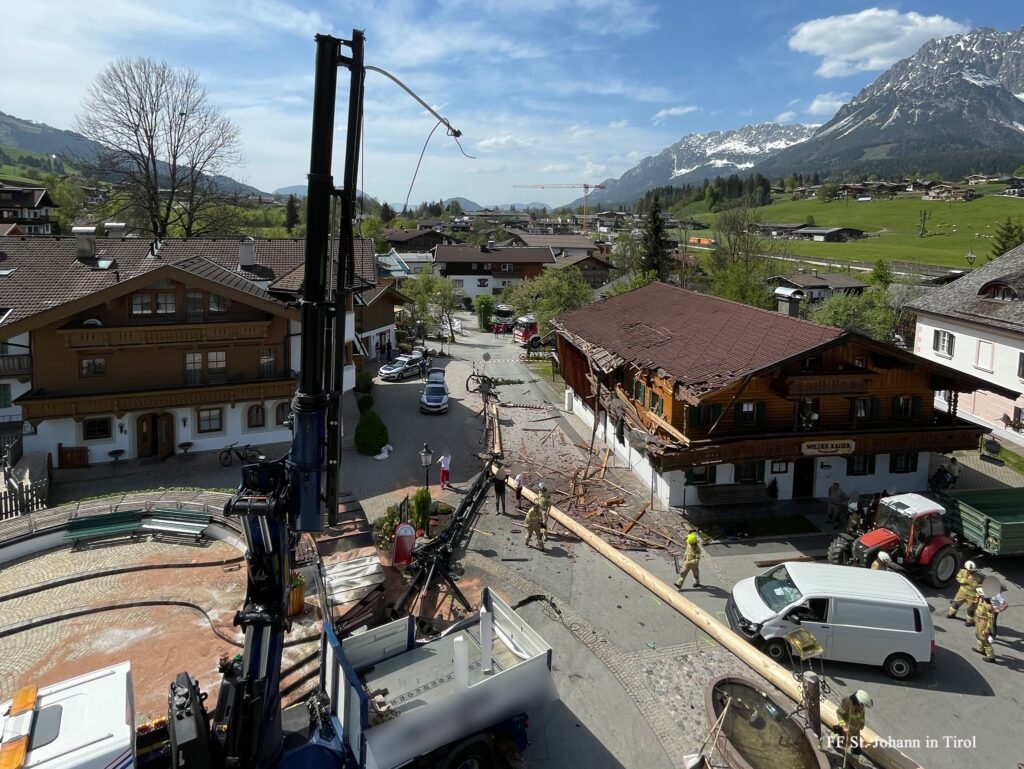 Ein siebenjähriger Junge (Österreicher) wurde vom herabfallenden Ausleger getroffen und erlitt dadurch schwere Verletzungen im Bereich des Fußes sowie Verletzungen unbestimmten Grades im Bereich des Gesichts. Er wurde vom Rettungshubschrauber in das Krankenhaus nach Innsbruck geflogen. Der herabfallende Baum traf ein nebenstehendes Gebäude, welches als Gasthof Wilder Kaiser in der Fernsehserie „Der Bergdoktor“ bekannt ist sowie ein Fahrzeug, welche dadurch erheblich beschädigt wurden. Der Dorfplatz wurde für die Dauer der Unfallaufnahme und Aufräumarbeiten gesperrt. Weitere Erhebungen zum Unfallhergang sind im Gange.