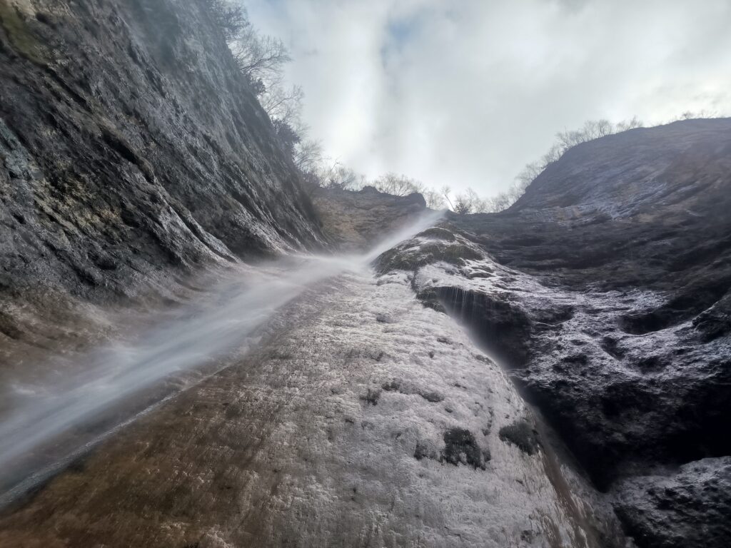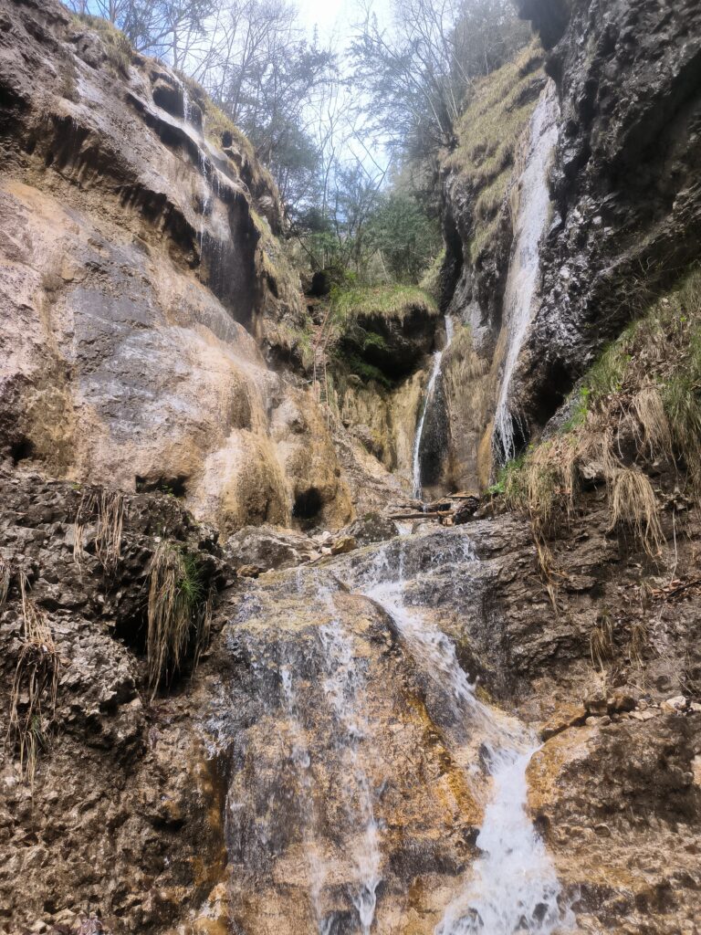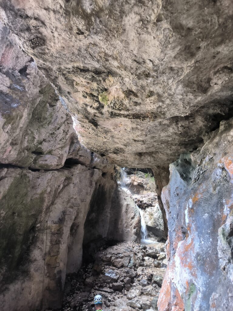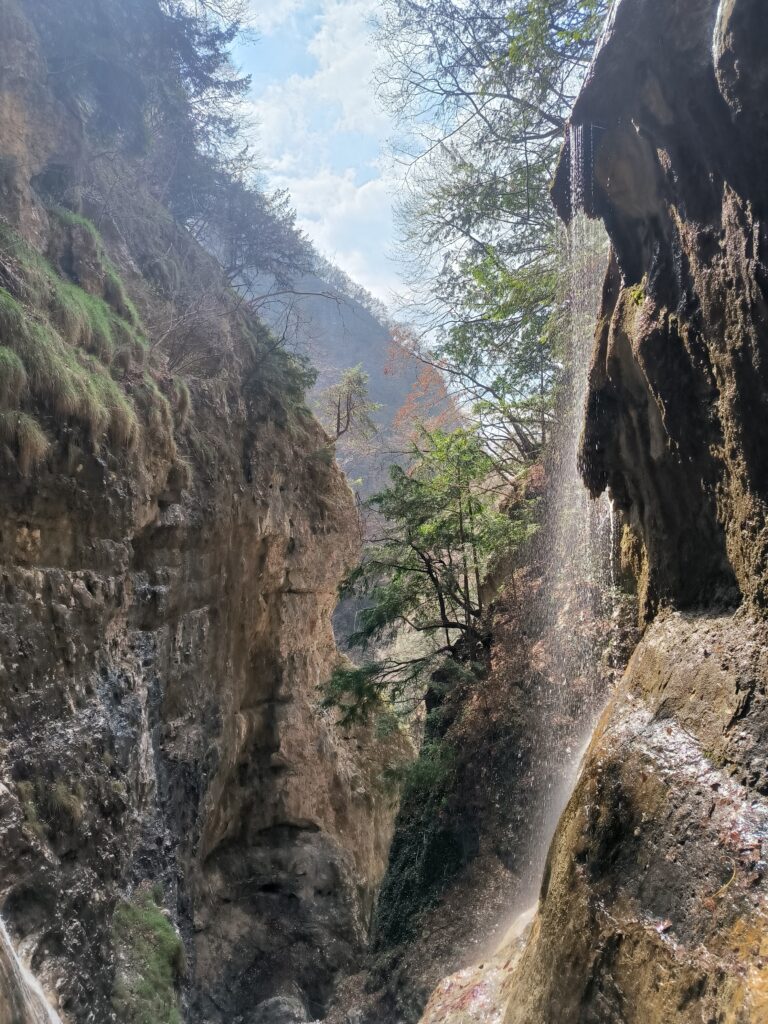 Da subito essa si apre alla nostra vista quando scendendo a picco dalla roccia crea un bacino limpido da dove apre la prima di tre lunghe scale che consentono di risalire il monte di Mezzocorona. Per un lungo tratto l’acqua lascia spazio alla roccia, che si percorrere sempre però accompagnati dal suo suono in lontananza. Poi, quando si entra nell’altro della roccia, il profondo canyion creato dall’acqua ci immerge direttamente nel suo mondo. Ora siamo in balia della sua forza. Attratti dal suo fragore ci inerpichiamo lungo le pareti levigate della roccia, i cui colori e le cui striature si mostrano in una bellezza senza tempo, creata dalla carezza dell’acqua.