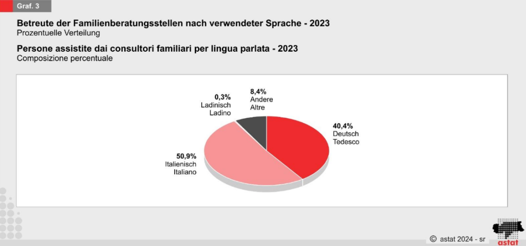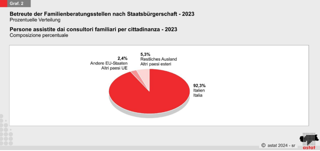 Die meisten betreuten Personen (92,3 Prozent) besitzen die italienische Staatsbürgerschaft. Die restlichen verteilen sich auf außereuropäische (5,3 Prozent) und andere europäische Staatsbürgerschaften (2,4 Prozent). Diese Verteilung spiegelt die demografische Zusammensetzung der Region wider und zeigt, dass die Familienberatungsstellen auch für Menschen mit Migrationshintergrund eine wichtige Anlaufstelle sind.
