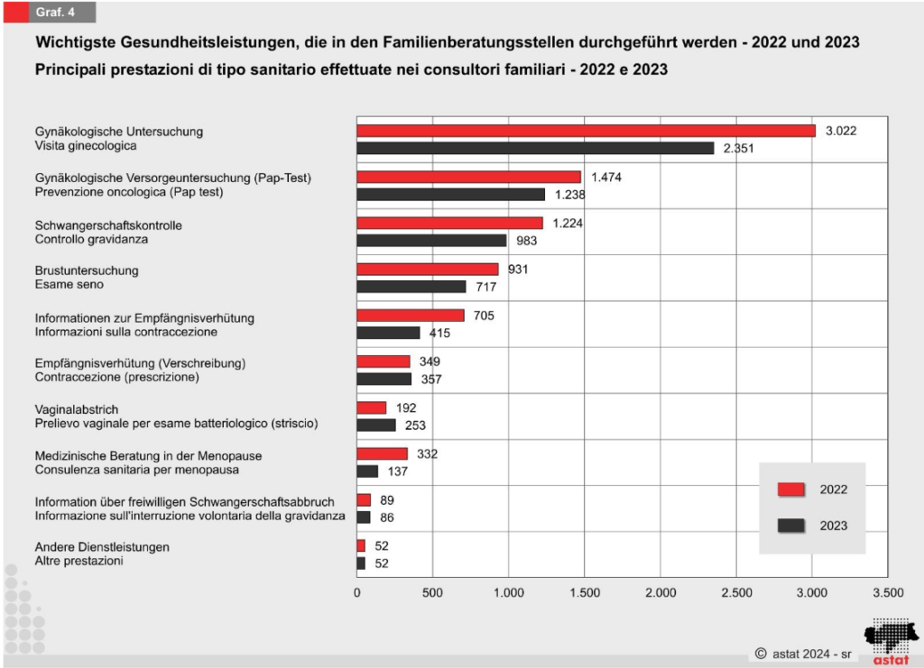 Im Jahr 2023 wurden 6.589 Gesundheitsleistungen erbracht, was einem Rückgang von 27 Prozent gegenüber 2022 entspricht. Die gynäkologischen Untersuchungen machen dabei 35,7 Prozent der Leistungen aus. Eine Ausnahme bildet der Vaginalabstrich, der von 253 Frauen in Anspruch genommen wurde (im Vergleich zu 192 im Jahr 2022).