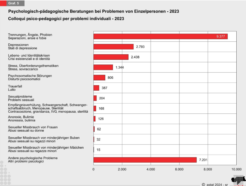 Die psychologisch-pädagogischen Gespräche nahmen zu, wobei fast 25.000 Gespräche geführt wurden. Besonders häufig wurden Themen wie Trennung, Ängste und Phobien (37,6%) angesprochen. Auch die Beratungen zu Depressionen (2.793 im Jahr 2023 gegenüber 2.481 im Jahr 2022) und anderen psychologischen Problemen (Anstieg von 4.867 auf 7.201) nahmen zu.
