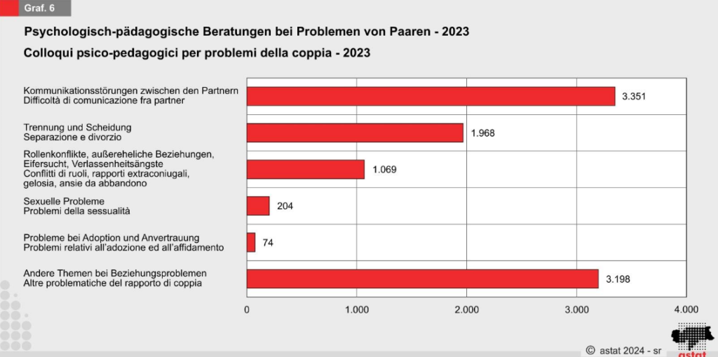 Bei Paarproblemen standen Kommunikationsschwierigkeiten (34 Prozent) und Trennung/Scheidung (20 Prozent) im Vordergrund. Die Anzahl der Gespräche zu sexuellen Problemen stieg um 87,2 Prozent, und Hilfe bei Problemen bei Adoption und Anvertrauung nahm um 40 Prozent zu.