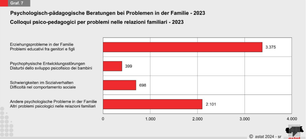 Im Jahr 2022 wurden 6.573 Gespräche aufgrund von Problemen in Familienbeziehungen geführt, wobei 51,3 Prozent Erziehungsprobleme zwischen Eltern und Kindern betrafen. Schwierigkeiten im Sozialverhalten nahmen von 610 (2022) auf 698 (2023) zu.