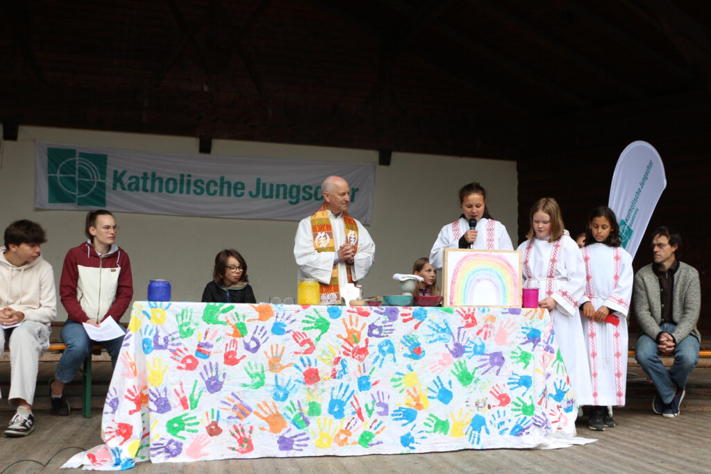 Jungscharseelsorger Gottfried Ugolini feierte gemeinsam mit den Ministranten den Gottesdienst zum Thema „Unter Gottes Himmel haben alle Platz!“ – Foto: Katholische Jungschar Südtirol
