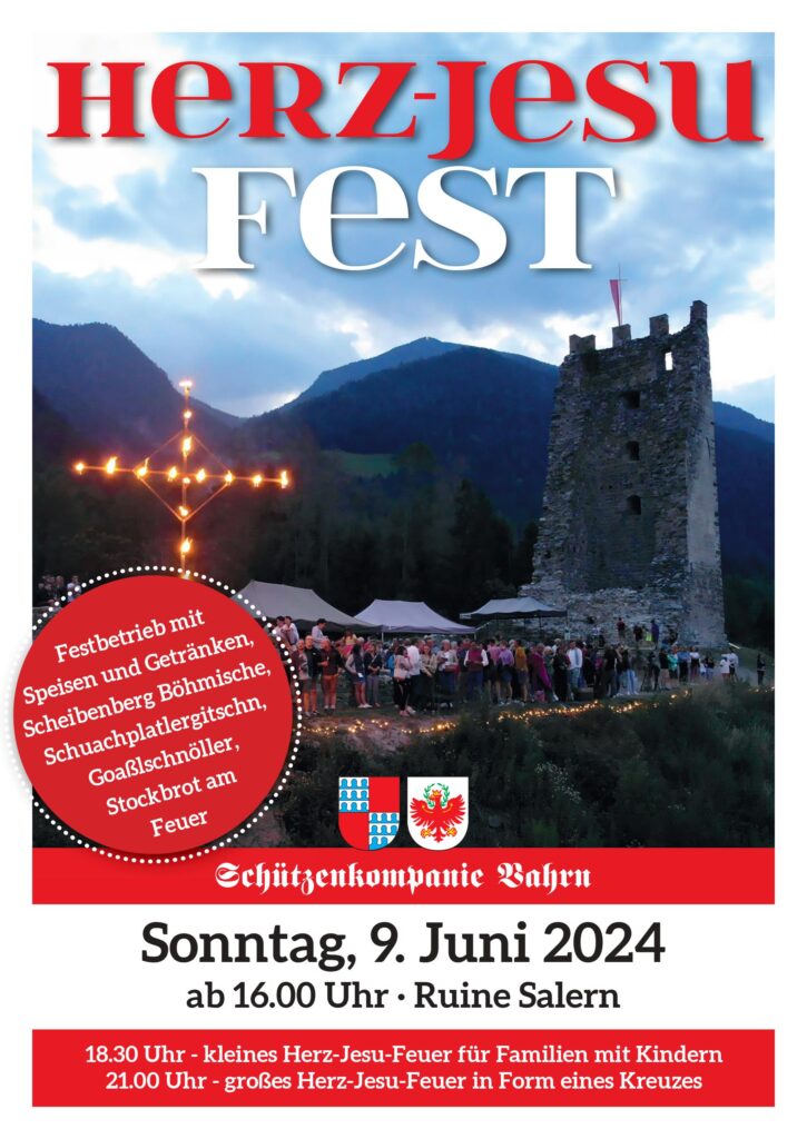 Der Festtag beginnt am 9. Juni wie gewohnt um 9.00 Uhr mit der Heiligen Messe in der Vahrner Pfarrkirche. Dabei wird auch das Herz-Jesu-Gelöbnis erneuert. Um 16.00 Uhr beginnt dann die Festveranstaltung bei der Ruine Salern. Bereits ab 16.30 Uhr sorgt die Scheibenberg Böhmische für gute Stimmung. Weiters werden die Vahrner Schuachplattlergitschn, Goaßlschnöller und Ziehorgelspieler das Fest bereichern. Für das leibliche Wohl ist neben diversen Getränken mit Gegrilltem gesorgt. Für die Kinder gibt es Stockbrot am offenen Feuer. Die Schützen wollen dieses große Tiroler Fest heuer gemeinsam mit der Bevölkerung feiern und die Tradition des Herz-Jesu-Feuers in Vahrn weiterführen.