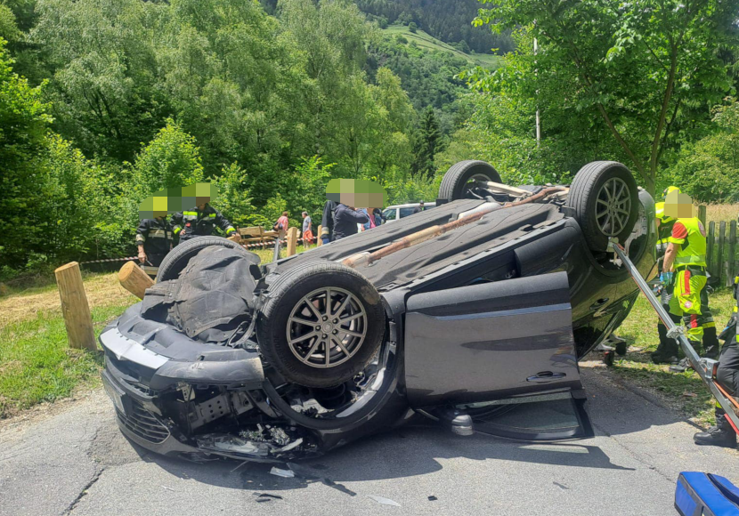 Kurz nach 12.30 Uhr wurden die Einsatzkräfte zum Wasserfallweg alarmiert. Wie die Freiwillige Feuerwehr von Partschins berichtet, ist ein Auto aus noch ungeklärten Gründen gegen einen Begrenzungspfosten gekommen und überschlug sich. Anschließend kollidierte es mit einem entgegenkommenden Fahrzeug und kam schließlich auf dem Dach zum Liegen.