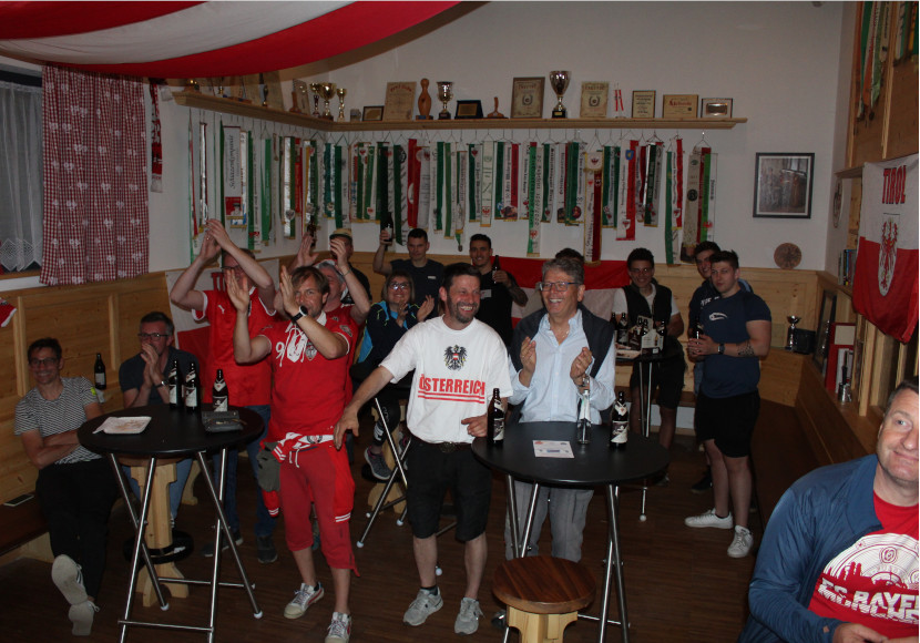 Das „Österreich-Haus“ – eine Idee rund um Hauptmann Werner Burger, Oberleutnant Walter Kofler und den Mitgliedern Günther Mairhofer und Stefan Schenk. Damit es auch „richtig österreichisch“ im Schützenheim wird, gibt es österreichisches Bier aus Nordtirol und Leberkässemmel. Zudem wurden etliche rot-weiß-rote Flaggen und Schals im „Österreich-Haus“ platziert. „Hier werden wir jetzt sieben Mal unserer Mannschaft die Daumen drücken“, sagt Mairhofer und spielt dabei auf mögliche sieben Spiele bis zum EM-Finale an.