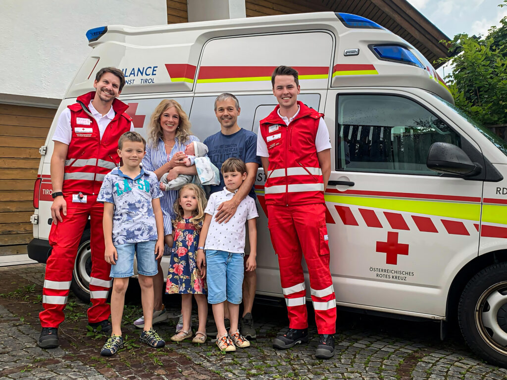 Teresa Senfter, die nun stolze Mutter von drei Söhnen und einer Tochter ist, erzählt: „Wir hatten schon eine Vorahnung, dass die Geburt an diesem Tag ansteht. Während wir ein Fußballspiel schauten, hatte ich bereits erste Wehen, aber die Abstände waren noch lang genug, um es bis zur Halbzeit zu schaffen.“ Nach dem Anruf beim Notruf 144 in der Leitstelle Tirol dauerte es nur wenige Minuten, bis das Team vom Roten Kreuz Stubai vor Ort war. „Im Rettungswagen auf der A13 bekam ich eine heftige Wehe, kurze Pause und die nächste. Plötzlich war die Fruchtblase geplatzt und ich wusste, die Geburt steht unmittelbar bevor.“